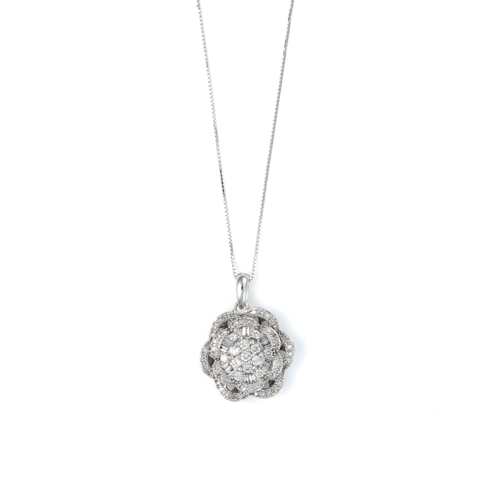 Experience the timeless allure of the Marks Estate Dept 1 Natural Diamond Necklace, a luxurious piece that embodies elegance and sophistication. Crafted in 14 Karat White Gold, this exquisite necklace showcases a harmonious blend of 66 round diamonds weighing a total of 0.20 carats, complemented by 12 additional round diamonds totaling 0.24 carats, and 12 baguette diamonds adding 0.06 carats. Each natural diamond is selected for its H/I color and SI2-I1 clarity, ensuring a captivating sparkle that radiates with every movement.