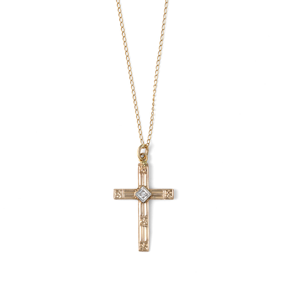 Natural Diamond Necklace in 14 Karat White - Yellow with 1 Round Diamond, Color: H, Clarity: I1, totaling 0.01ctw Chain Type: Pendant Rope Chain Length: 1.25 Clasp Type: Spring Ring Necklace Type: Cross Collection: M Estate "This item is an estate piece of jewelry, often one-of-a-kind, and has been previously owned. It has been refurbished by our master jewelers to be enjoyed again."