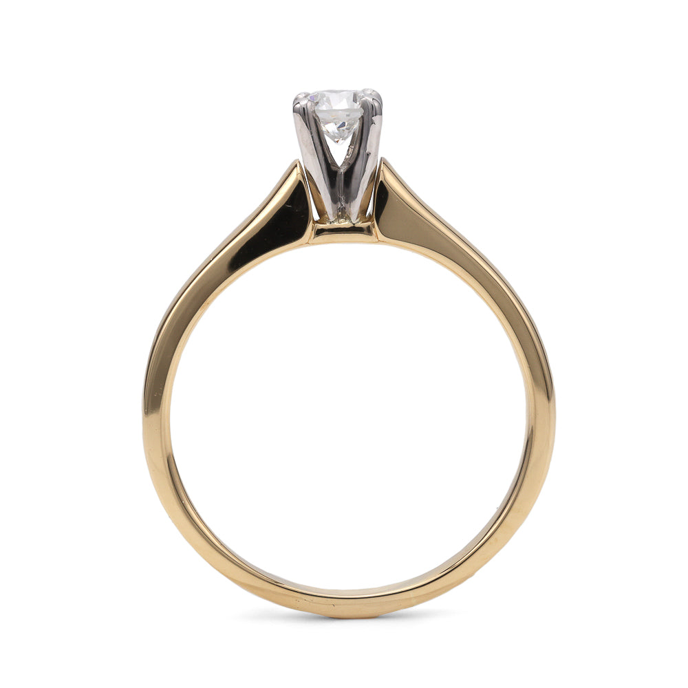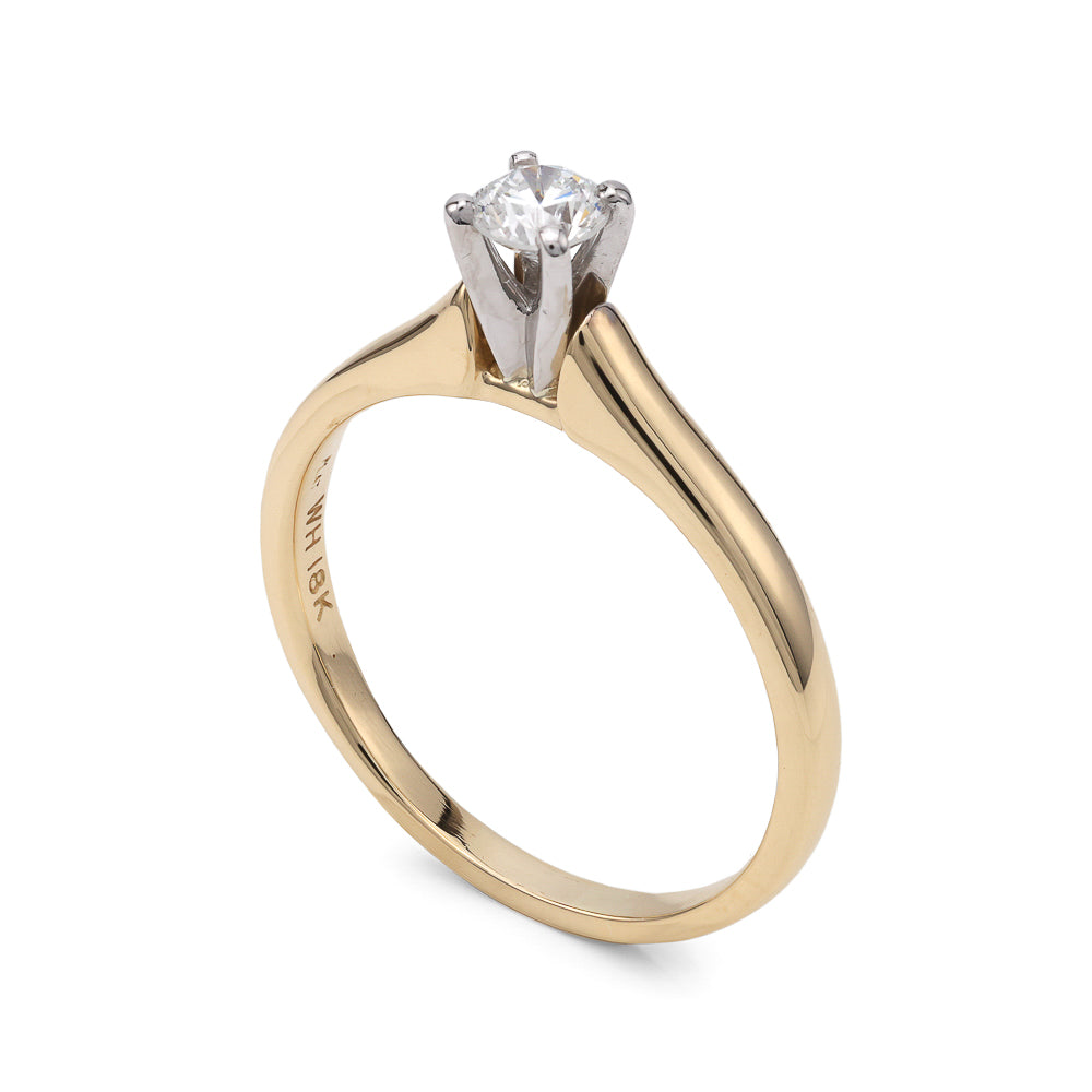 Embrace the timeless elegance of the Marks Estate Department 2 Natural Diamond Solitaire Engagement Ring, a distinguished piece from our M Estate Collection. This stunning ring features a round natural diamond with an impressive F color and SI2 clarity, totaling 0.33 carats. Expertly set in 18 Karat Platinum, the piece showcases a harmonious blend of white and yellow hues, offering a captivating contrast that enhances its overall allure.