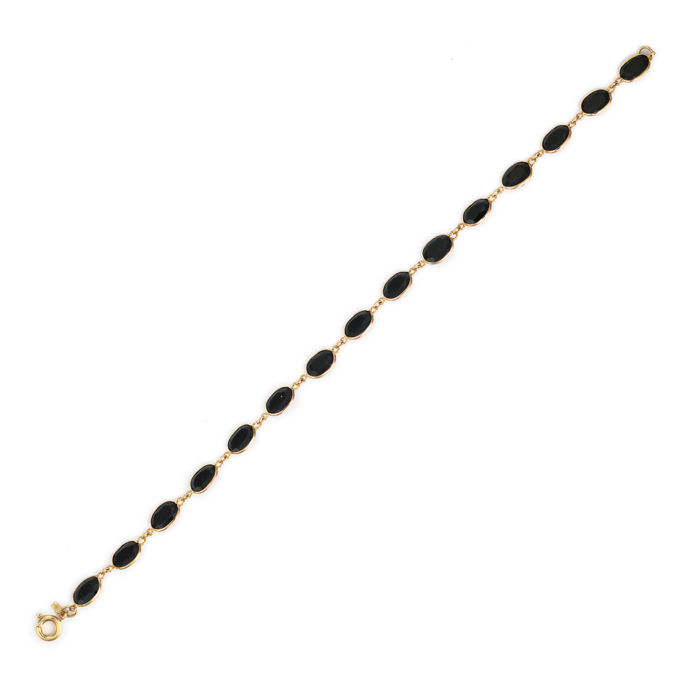Indulge in the timeless elegance of the Marks Estate Dept 1 Oval Link Color Gemstone Bracelet, a truly captivating piece designed for the discerning lady. This exquisite bracelet showcases a mesmerizing oval black spinel, beautifully set within lustrous 14 karat yellow gold. Its distinctive oval link design exudes classic charm, making it a versatile accessory for both everyday elegance and special occasions. Measuring 7.5 inches, it is crafted with comfort and security in mind, featuring a reliable spring ring clasp. Expertly refurbished by skilled jewelers, this estate piece promises lasting brilliance and allure, restored to its original splendor. Priced attractively at $359.40, reduced from $599.00, this bracelet offers exceptional value, allowing you to embrace a unique piece that resonates with personal style and sophistication. Whether adding depth to your jewelry collection or gifting it as a cherished symbol of personal milestones, this bracelet captures the essence of timeless elegance. Experience the unmatched quality and historical significance of the Marks Estate collection today. Don't miss your chance to own this extraordinary piece; add the Marks Estate Dept 1 Oval Link Color Gemstone Bracelet to your collection now.