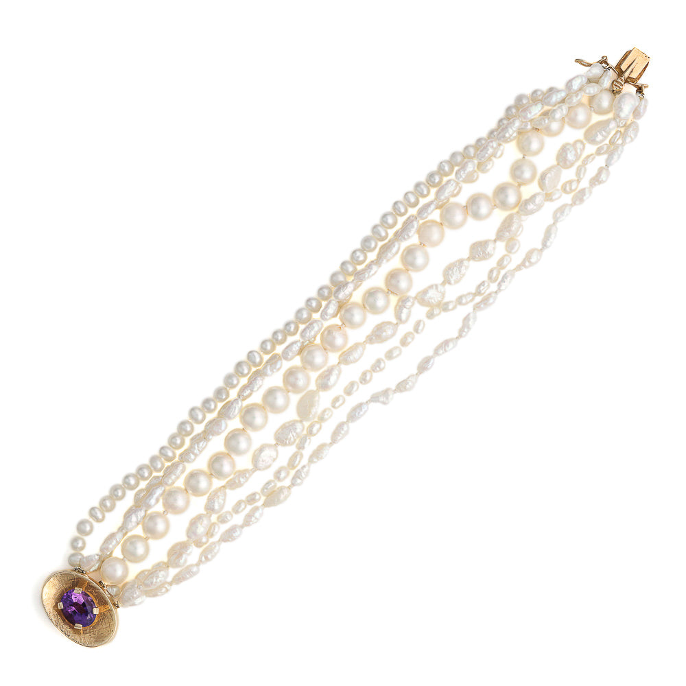 Immerse yourself in the allure of timeless elegance with the ReMARKable Estate Collection Pearl Strand Color Gemstone Bracelet, an exquisite offering from Marks Jewelers. Crafted in radiant 14 Karat Yellow Gold, this bracelet features a stunning oval Amethyst, celebrated for its deep, royal hue. The Amethyst's allure is beautifully complemented by an array of 202 lustrous Japanese Freshwater Pearls and 25 exquisite Akoya Pearls, creating a harmonious blend of classic and modern sophistication.This estate piece, expertly refurbished by skilled jewelers, reflects an unmatched commitment to craftsmanship and quality. Each pearl strand is meticulously selected and strung, resulting in a seamless design that mirrors the artistry synonymous with our brand. More than just a piece of jewelry, this bracelet is a celebration of life's milestones, offering heirloom-worthy elegance that can be cherished for generations.Designed for ladies, this 8-inch bracelet ensures both secure and comfortable wear with its discreet plunger clasp. Whether as a meaningful self-gift or a heartfelt present to a loved one, it symbolizes the unique beauty of the wearer. Elevate your jewelry collection with a piece that not only tells a story but embodies exceptional quality and timeless design.Explore the elegance of the ReMARKable Estate Collection and let your style shine with this captivating piece. Discover the perfect blend of history and elegance-add this treasure to your collection today.This item is an estate piece of jewelry, often one-of-a-kind, and has been previously owned. It has been refurbished by our master jewelers to be enjoyed again.