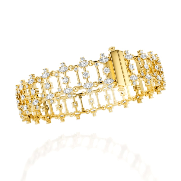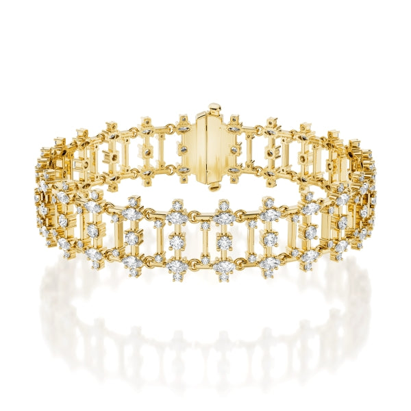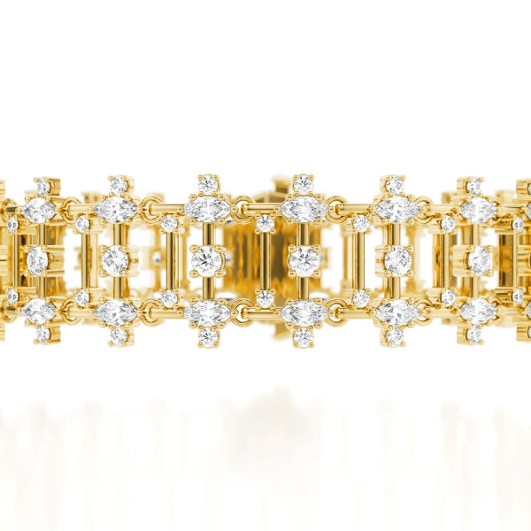 Indulge in the epitome of luxury with the Noam Carver Natural Diamond Bracelet, a masterpiece that reflects exceptional artistry and elegance. This exquisite bracelet, crafted from luminous 14 Karat Yellow Gold, is designed to showcase the beauty of natural diamonds. Featuring 48 marquise diamonds with a total weight of 4.80 carats and 118 round diamonds totaling 2.29 carats, each stone is carefully selected for its G/H color grade and SI2 clarity, offering unparalleled brilliance and sparkle.
