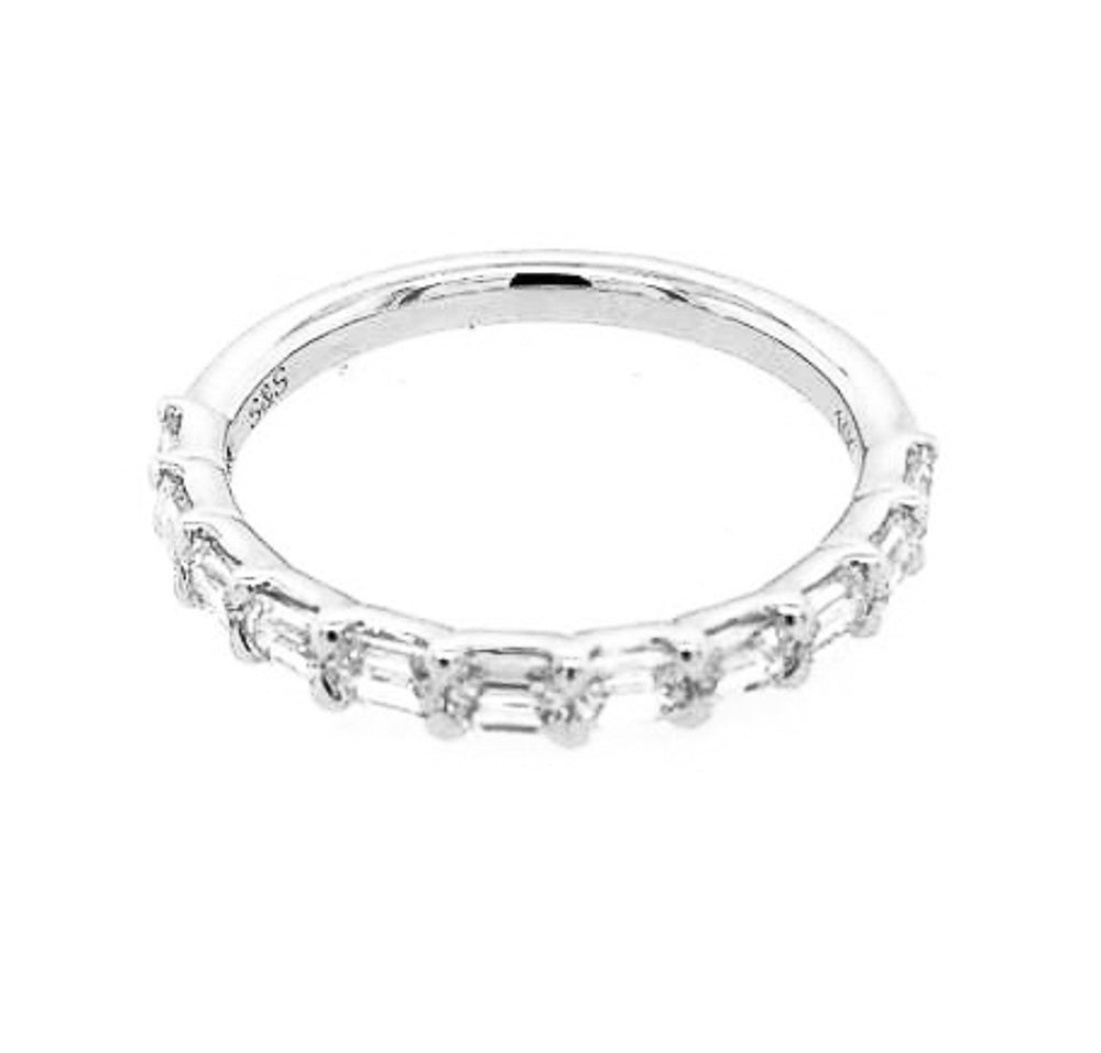 Discover the exquisite elegance of the ReMARKable Designs Natural Diamond Ladies Wedding Band, a testament to timeless beauty and sophisticated design. This stunning piece is crafted in lustrous 14 Karat white gold, offering a modern yet classic appeal. Adorned with 11 meticulously chosen natural emerald-cut diamonds, this ring showcases a total carat weight of 1.10, perfect for those who appreciate the finer things in life.