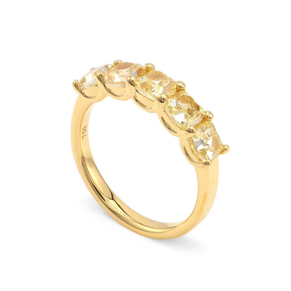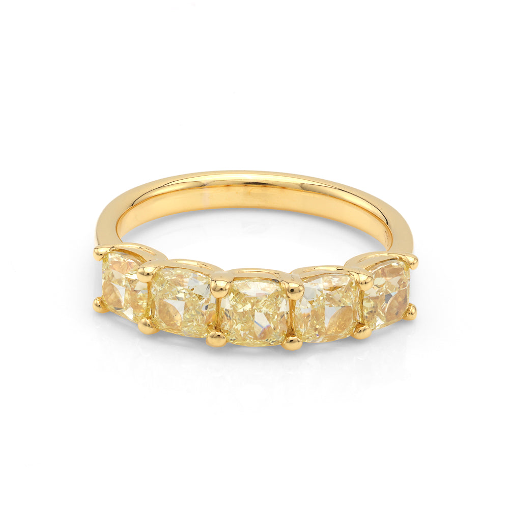 Embrace the extraordinary with the ReMARKable Designs Natural Diamond Band, a masterpiece of luxury and artistry. This exquisite band boasts five hand-selected yellow cushion-cut natural diamonds, offering a dazzling total weight of 2.70 carats. Each stone is carefully chosen for its exceptional clarity, ensuring a breathtaking sparkle that epitomizes sophistication. Crafted in 14 Karat yellow gold, the vibrant diamonds are beautifully complemented by the rich opulence of the metal, creating a perfect symphony of color and brilliance. The band, with a sleek width of 2.33mm, is available in a size 7.25, combining elegance with comfort for everyday wear. As a 'ReMARKable Product', this piece is a testament to Marks Jewelers' legacy of unparalleled craftsmanship and timeless elegance. Whether worn as a wedding band or cherished as a personal gift, it celebrates life's significant moments with dignity and style. Priced at $7,850.00, this band is more than a piece of jewelry; it's a declaration of personal journey and refined taste. Enhance your collection with the ReMARKable Designs Natural Diamond Band and let its timeless elegance reflect your unique style. Seize the opportunity to own an embodiment of exceptional artistry today.
