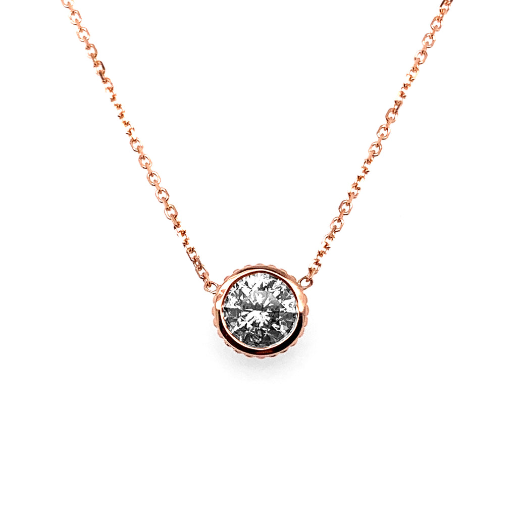 Delve into the luxurious allure of this Natural Diamond Necklace, a stunning creation from ReMARKable Designs. Crafted in 14 Karat Rose Gold, this necklace gleams with a modern yet timeless elegance. At its heart, a 1.12 carat round natural diamond captivates with its H hue and I2 clarity, a true testament to nature's unrivaled beauty. Each diamond is carefully chosen by expert graduate gemologists, ensuring the highest quality and authenticity that sets ReMARKable Designs apart.