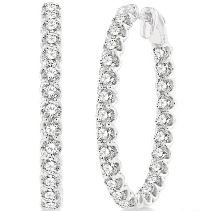Embrace the elegance of ReMARKable Designs with these Oval Hoop Natural Diamond Earrings, crafted from luxurious 14 Karat White Gold. Each earring features an impressive array of 50 round natural diamonds, totaling 5.00 carats, meticulously set to maximize their brilliance. The sleek oval shape and hinged snap closure ensure a secure and comfortable fit, making these earrings a perfect blend of sophistication and practicality for any occasion.