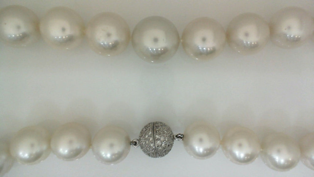 Color Gemstone Necklace in 18 Karat White with 29 South Sea Pearls, and 116 Round Diamonds, totaling 1.64ctw Chain Type: No Chain Chain Length: 18 Clasp Type: Barrel Necklace Type: Pearl Strand