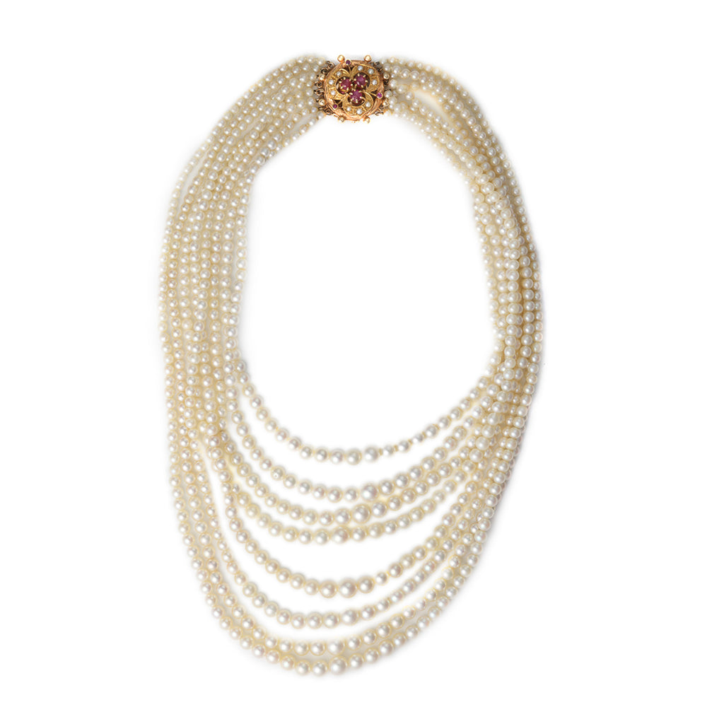 Immerse yourself in the timeless allure of the ReMARKable Estate Collection with this exquisite Color Gemstone Necklace, a true testament to elegance and sophistication. Crafted with 14 Karat rose gold, this stunning piece showcases a mesmerizing array of 143 cultured pearls in a multi-strand design, each pearl hand-selected by our expert graduate gemologists to ensure the highest quality and clarity. The opulent rose hue of the gold beautifully complements the lustrous pearls, creating a harmonious blend of luxury and charm.This estate necklace, carefully refurbished by the skilled artisans of Marks Jewelers, maintains its original splendor while being ready to accompany you on new journeys. The seamless hidden plunger clasp adds a touch of modern elegance, ensuring a flawless finish that complements the necklace's sophisticated aesthetic. Perfect for celebrating personal milestones or as a meaningful gift, this necklace is a symbol of grace and refinement.Experience the enduring legacy of Marks Jewelers, where each piece tells a story of beauty and craftsmanship. Let this unique estate piece become a cherished part of your collection. Indulge in the luxury of owning a piece that transcends time and trends. Visit us and embrace the elegance that awaits you.This item is an estate piece of jewelry, often one-of-a-kind, and has been previously owned. It has been refurbished by our master jewelers to be enjoyed again.