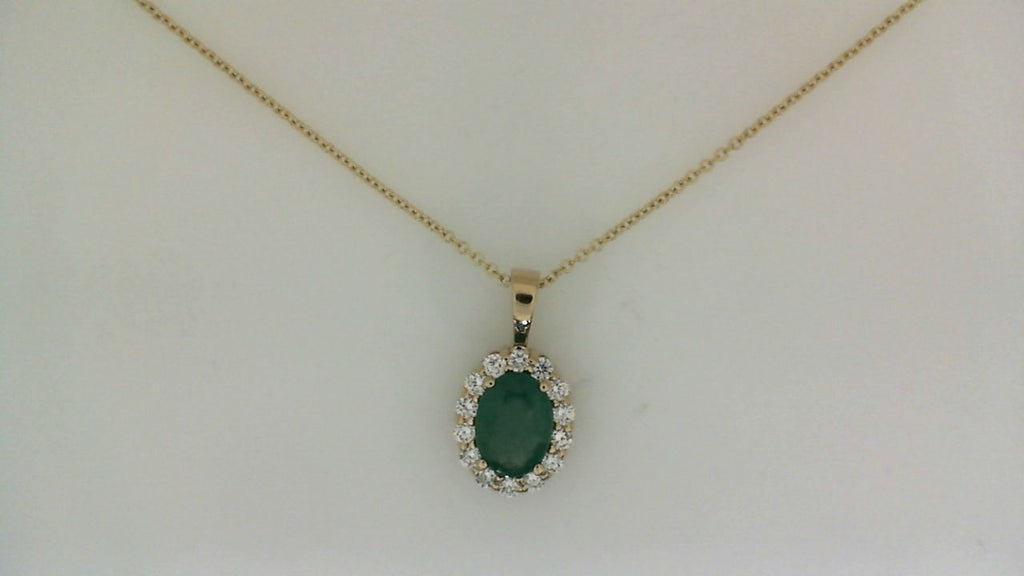 Color Gemstone Necklace in 14 Karat Yellow with 1 Pear Emerald, totaling 1.15ctw Round Diamond, totaling 0.30ctw Chain Type: Cable Link Chain Length: 18 Clasp Type: Lobster Claw Necklace Type: Pendant