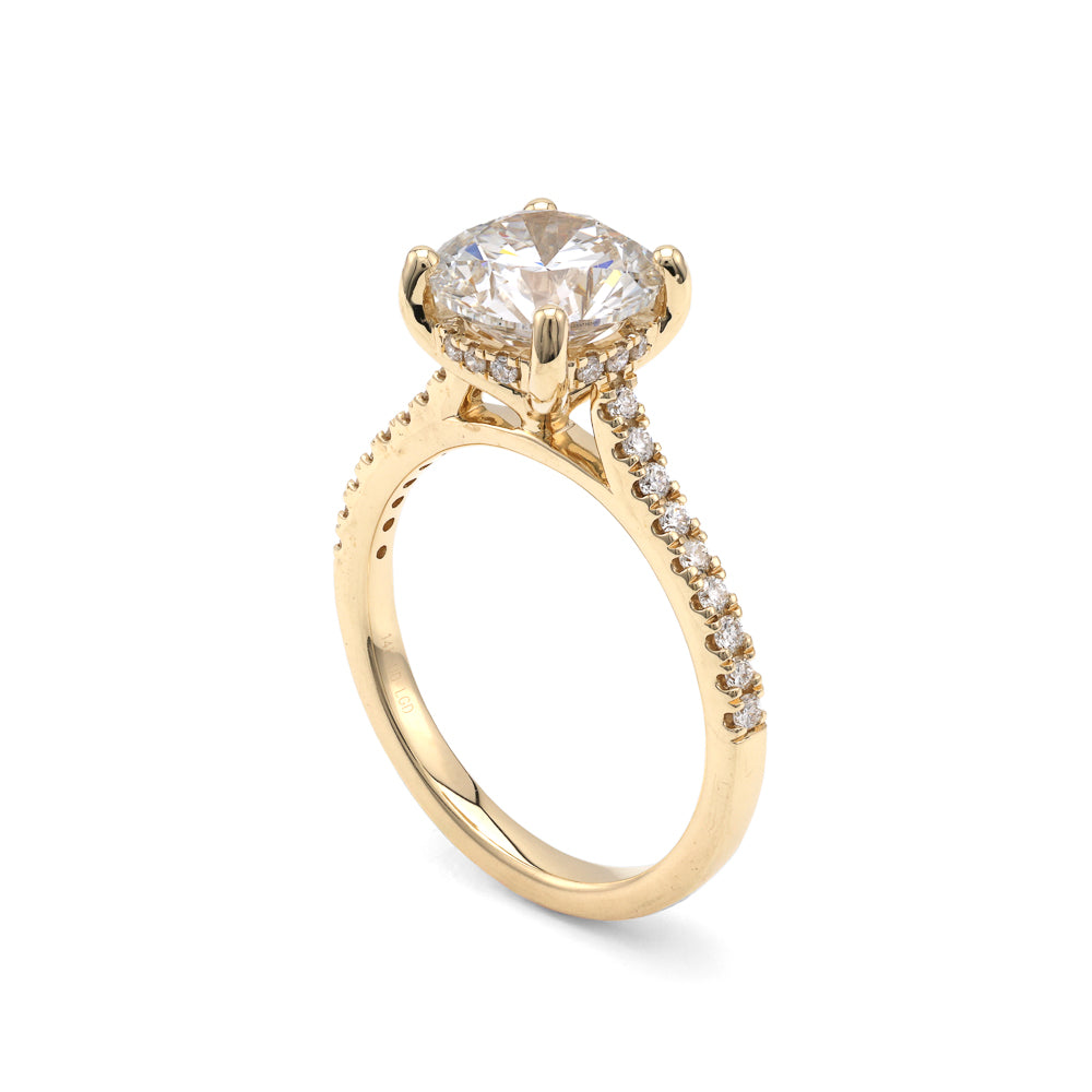 Discover the ReMARKable Designs Lab-Grown Diamond Complete Engagement Ring, an exquisite symbol of love and elegance. This breathtaking piece features a stunning 1 Round Lab-Grown Diamond with a total weight of 2.50 carats, boasting a radiant G color and VS2 clarity. Accentuated by 30 additional Round Lab-Grown Diamonds, adding 0.29 carats, this ring's brilliance is gracefully set in a luxurious 14 Karat Yellow Gold band. Designed to fit comfortably at size 7, this engagement ring embodies the perfect fusion of classic sophistication and modern sustainability, making it a true masterpiece from ReMARKable Designs
