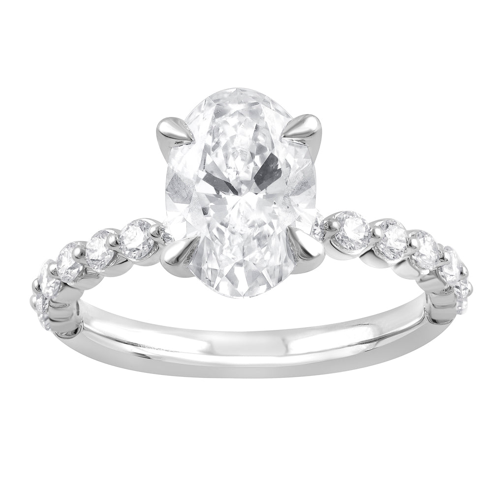 Discover elegance and innovation with the Side Stone Lab-Grown Diamond Complete Engagement Ring from ReMARKable Designs. Expertly crafted for the discerning woman, this exquisite piece features a stunning 1 Oval Lab-Grown Diamond with a remarkable total carat weight of 2.14. With a pristine G color and VS2 clarity, the centerpiece exudes brilliance and sophistication. Complementing the oval diamond, 14 Round Lab-Grown Diamonds add an additional 0.39 carat weight, enhancing the ring's allure with their radiant sparkle. Set in luxurious 14 Karat White gold, this engagement ring is not only a testament to your love but also to modern advancements in diamond creation. The lab-grown diamonds offer the same breathtaking beauty as natural stones, symbolizing your commitment to sustainable luxury. Sized at 7, it comfortably adorns any bride's hand, perfect for celebrating one of life's most cherished moments or even as a meaningful self-gift to honor personal achievements. Embrace this masterpiece of craftsmanship and ethical elegance, and let it be the cornerstone of your everlasting bond. Experience the future of jewelry today. Visit us now to make this stunning piece yours.Lab-grown disclaimer. Growing a diamond in a laboratory is still a very complex and costly process. As time goes on and more companies begin to produce these diamonds the price will change due to competition and advancement in technology. For those reasons we are not able to include Lab Grown diamonds in our lifetime upgrade policy.