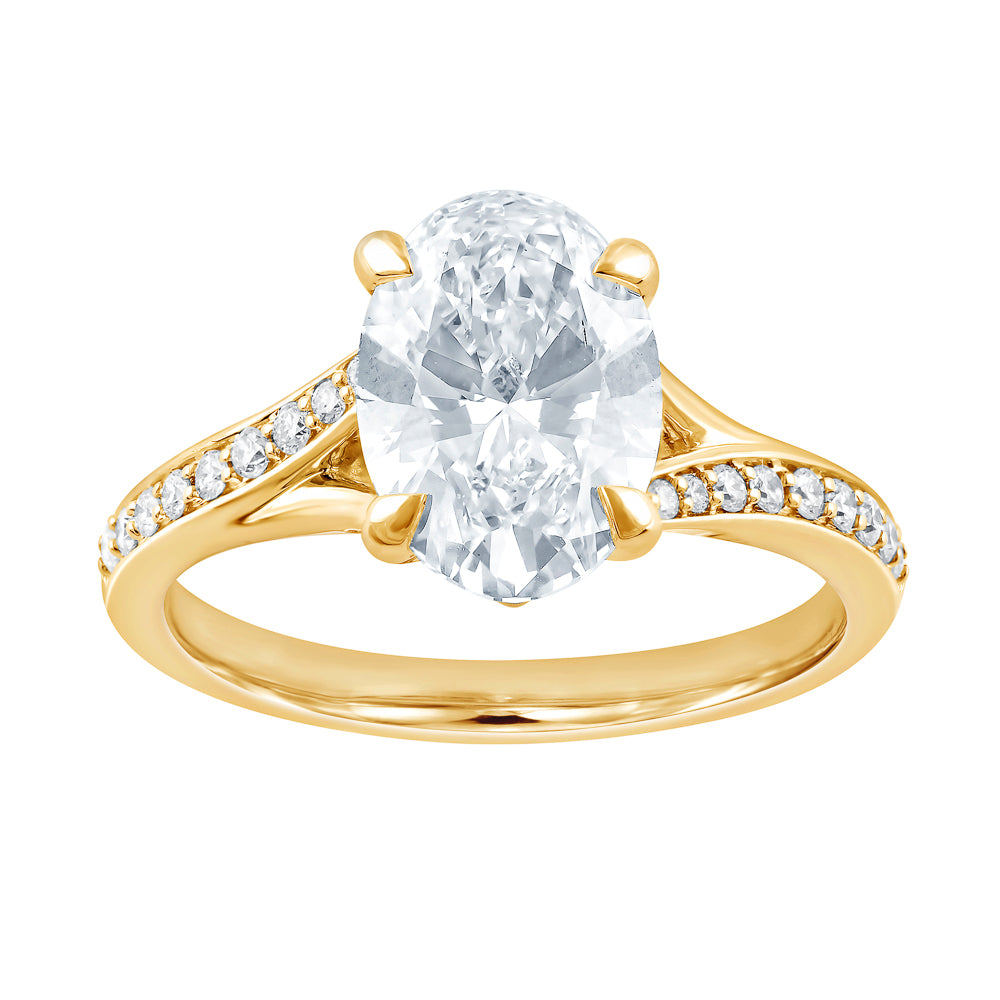 Celebrate love and elegance with our exquisite Side Stone Lab-Grown Diamond Complete Engagement Ring, crafted for the discerning lady. This stunning piece features a remarkable 1 Oval Lab-Grown Diamond, boasting a pristine F color and VVS2 clarity, totaling 2.46 carats. Complemented by 18 additional round lab-grown diamonds totaling 0.15 carats, this ring captures the brilliance of sustainable luxury. Set in lustrous 14 Karat Yellow gold, it offers a warm and timeless appeal.Designed for a ring size 7, the sleek 2.2mm width ensures a comfortable fit, making it the perfect choice for everyday elegance or a special occasion statement. Lab-grown diamonds offer the same breathtaking beauty as natural diamonds, with the added benefit of ethical sourcing and innovative craftsmanship.This ring is more than just a symbol of commitment; it's a celebration of personal milestones and cherished memories. Whether you're marking an engagement, an anniversary, or gifting yourself a token of love, this piece is designed to last through the ages.Our engagement rings are not only a testament to fine jewelry design but also a meaningful investment in quality and style. Embrace this opportunity to own a piece of timeless beauty and sophistication. Visit us today to experience the allure of lab-grown diamonds firsthand and make this elegant ring yours.Lab-grown disclaimer. Growing a diamond in a laboratory is still a very complex and costly process. As time goes on and more companies begin to produce these diamonds the price will change due to competition and advancement in technology. For those reasons we are not able to include Lab Grown diamonds in our lifetime upgrade policy.