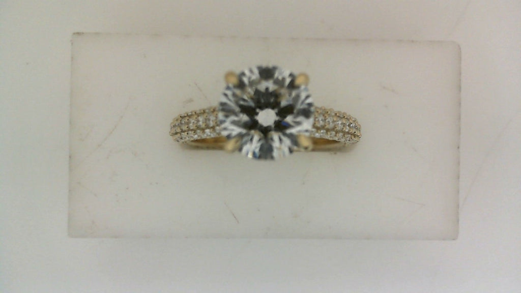 Growing a diamond in a laboratory is still a very complex and costly process. As time goes on and more companies begin to produce these diamonds the price will change due to competition and advancement in technology. For those reasons we are not able to include Lab Grown diamonds in our lifetime upgrade policy. Side Stone Lab-Grown Diamond Complete Engagement Ring in 14 Karat Yellow with 1 Round Lab Grown Diamond, Color: E, Clarity: VS2, totaling 2.00ctw, and 96 Round Lab Grown Diamonds, totaling: 0.75ctw Ring Size: 7 MM Width: 3