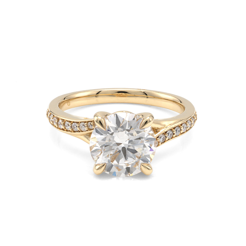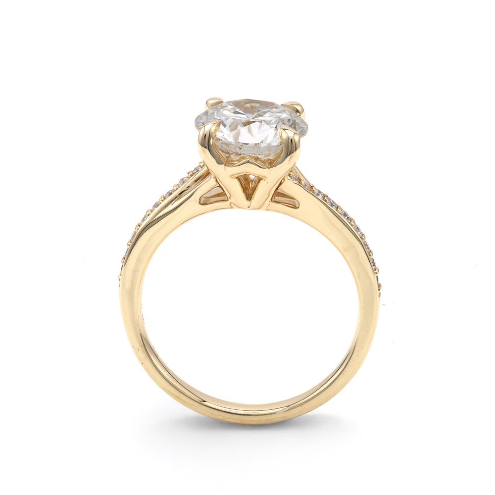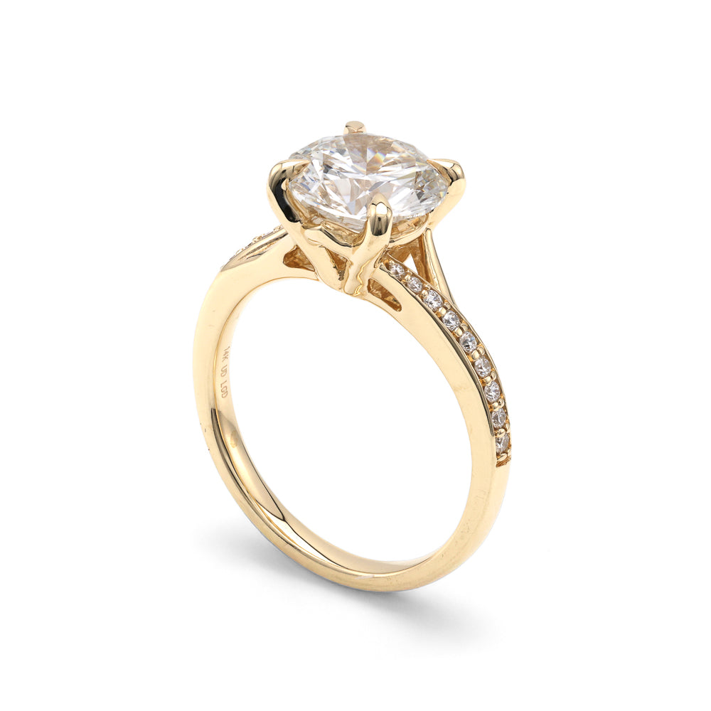 Discover the elegance and innovation embodied in our Side Stone Lab-Grown Diamond Complete Engagement Ring, crafted for the discerning woman seeking both style and sustainability. This exquisite piece features a stunning round lab-grown diamond as its centerpiece, boasting a remarkable 2.53 carat total weight. With a color grade of G and a clarity of VS2, this diamond radiates brilliance and purity, rivaling its natural counterparts. Complemented by 18 additional round lab-grown diamonds totaling 0.15 carats, this ring captures the light with every movement, enhancing its allure. Set in luxurious 14 Karat Yellow Gold, the metal's warm hue perfectly frames the diamonds, providing a timeless and sophisticated look. The ring, sized at 7 with a 2.2mm width, offers a comfortable fit for everyday wear, making it a perfect symbol of love and commitment.Crafted with precision by graduate gemologists, this engagement ring celebrates advanced technology and meticulous craftsmanship, ensuring you receive a piece of exceptional quality. Embrace the future of fine jewelry with lab-grown diamonds that offer beauty and value, while also being environmentally conscious.Whether you're marking a personal milestone or sealing a promise to a loved one, this ring makes a meaningful statement. Elevate your jewelry collection and make a lasting impression with this captivating engagement ring. Visit us today to experience the brilliance firsthand and let this ring be a part of your journey.Lab-grown disclaimer. Growing a diamond in a laboratory is still a very complex and costly process. As time goes on and more companies begin to produce these diamonds the price will change due to competition and advancement in technology. For those reasons we are not able to include Lab Grown diamonds in our lifetime upgrade policy.