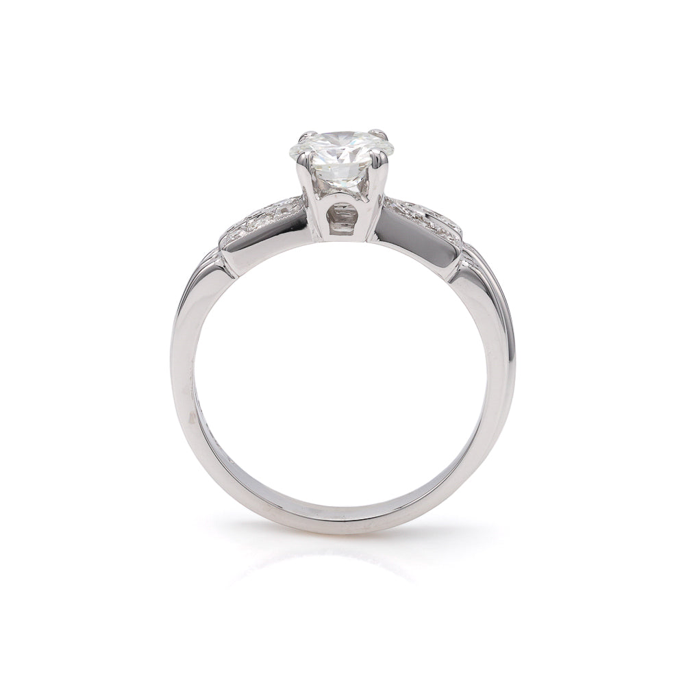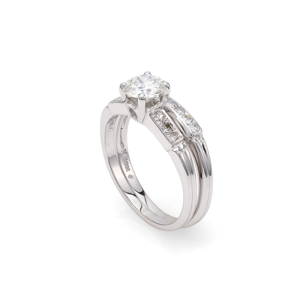 Experience the timeless allure of the ReMARKable Estate Side Stone Natural Diamond Complete Wedding Set, masterfully crafted in lustrous 18 Karat White Gold. This exquisite bridal set showcases a captivating round natural diamond as the centerpiece, boasting a total carat weight of 0.66. With a color grade of G and clarity of VS1, this diamond epitomizes brilliance and purity. Surrounding this central gem, six additional round diamonds enhance the sparkle, with a combined weight of 0.08 carats, graded H/I for color and VS for clarity.The matching wedding band is adorned with nine round diamonds, offering a harmonious accompaniment to the engagement ring, and together they achieve a total carat weight of 0.14. Meticulously refurbished by master jewelers, this estate piece is a testament to enduring beauty and superior craftsmanship, with each diamond hand-selected by expert graduate gemologists to ensure unparalleled quality.Sized at a refined 5.5 with a width of 2.9mm, this set is designed for the discerning lady. Whether commemorating an eternal bond or celebrating a personal milestone, this unique estate jewelry piece offers unmatched character and timeless elegance. Embrace the essence of luxury and make this remarkable set a part of your cherished moments.Indulge in a piece that resonates with history and individuality. Enhance your collection today and let the legacy of fine craftsmanship bring grace to your most treasured occasions. Act now to secure this one-of-a-kind treasure.This item is an estate piece of jewelry, often one-of-a-kind, and has been previously owned. It has been refurbished by our master jewelers to be enjoyed again.