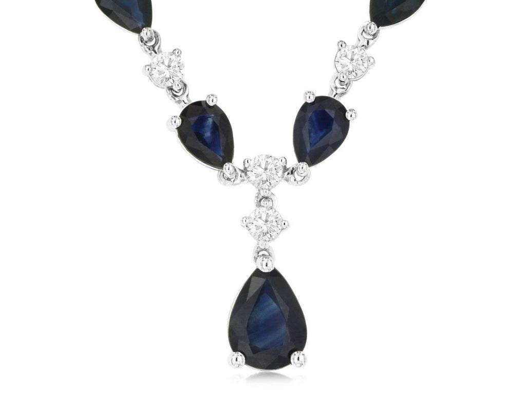Discover the captivating allure of the Station Color Gemstone Necklace by Royal Jewelry Manufacturing Inc., a masterpiece that blends timeless elegance with modern sophistication. This remarkable necklace showcases 23 exquisite pear-shaped sapphires, collectively weighing 11.40 carats, meticulously set in lustrous 14 karat white gold. The deep, enchanting blue of the sapphires is beautifully complemented by 22 round natural diamonds, totaling 1.50 carats, which add a dazzling sparkle to this elegant ensemble.