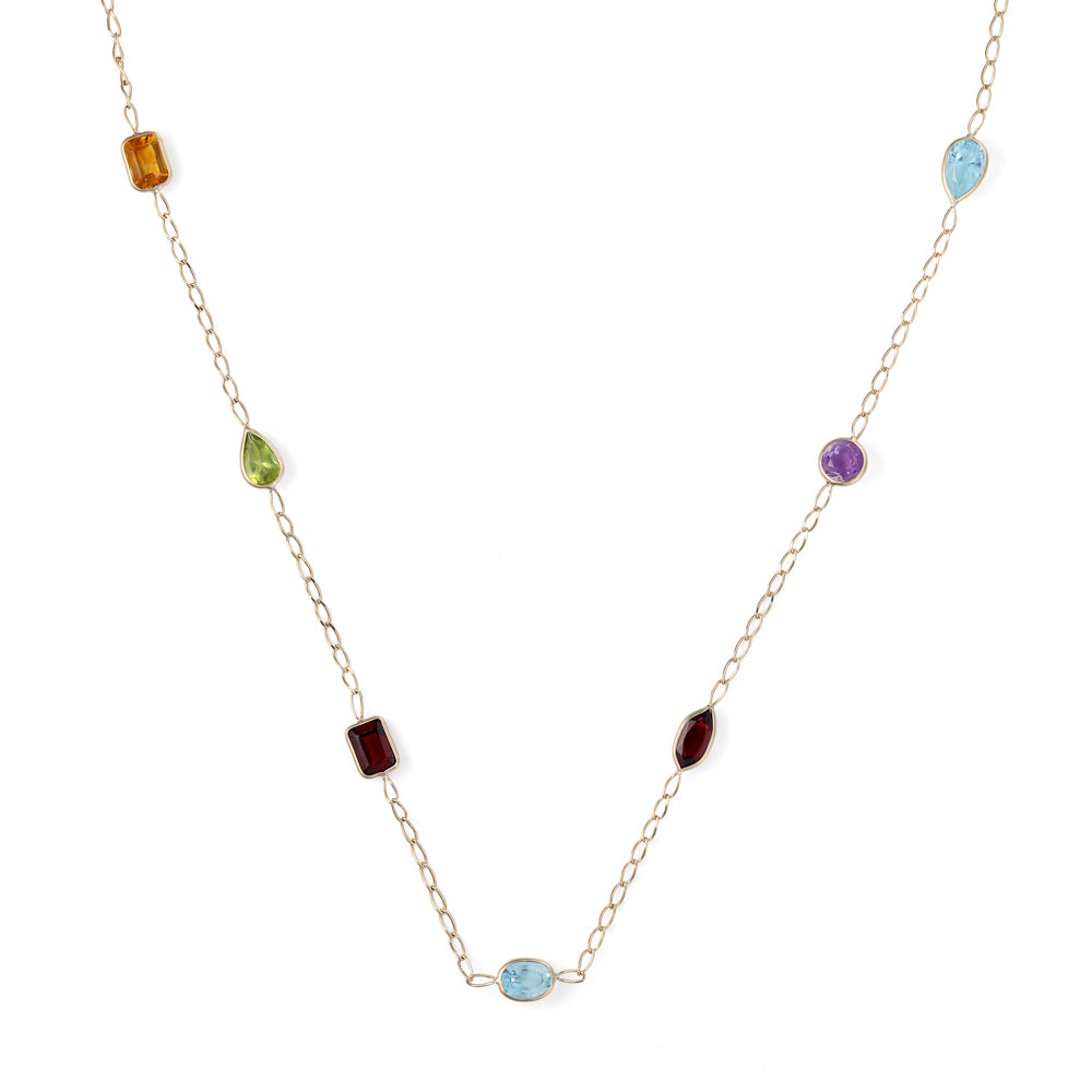 Color Gemstone Necklace in 14 Karat Yellow with 4 Various Shapes Garnets, and 4 Various Shapes Citrines and 4 Various Shapes Blue Topazes and 3 Various Shapes Amethysts Chain Type: Curb Chain Length: 35 Clasp Type: Spring Ring Necklace Type: Station Collection: M Estate "This item is an estate piece of jewelry, often one-of-a-kind, and has been previously owned. It has been refurbished by our master jewelers to be enjoyed again."