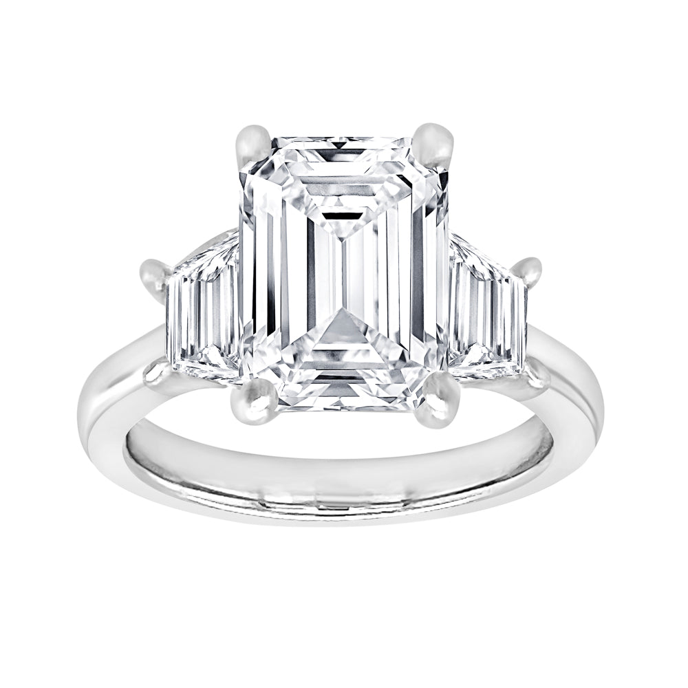 Introducing the exquisite Three Stone Lab-Grown Diamond Complete Engagement Ring by ReMARKable Designs, a stunning symbol of love and commitment. This elegant piece showcases a captivating 3.01ctw Emerald Lab-Grown Diamond with a pristine G hue and VS2 clarity, beautifully complemented by two Trapezoid Lab-Grown Diamonds totaling 1.00ctw, with a remarkable E/F color and VS1 clarity. Crafted in luxurious 18 Karat White gold, this ring offers a sophisticated blend of modern elegance and timeless charm.Designed for the discerning lady, this ring is available in size 6.75, ensuring a perfect fit for your special moment. Each diamond's impeccable quality and brilliance are a testament to the advanced technology and craftsmanship employed in its creation.Embrace the innovation of lab-grown diamonds, which possess the same physical and chemical properties as natural diamonds. Celebrate personal milestones or gift this ring as a meaningful token of love and appreciation. Let the brilliance of these exquisite lab-grown stones illuminate your journey together.Discover the allure of lab-grown diamonds with this breathtaking engagement ring. Visit us today to experience its beauty firsthand and make it yours. Elevate your love story with a piece that speaks volumes of elegance and sophistication. Shop now and find the perfect symbol of your everlasting love.Lab-grown disclaimer. Growing a diamond in a laboratory is still a very complex and costly process. As time goes on and more companies begin to produce these diamonds the price will change due to competition and advancement in technology. For those reasons we are not able to include Lab Grown diamonds in our lifetime upgrade policy.
