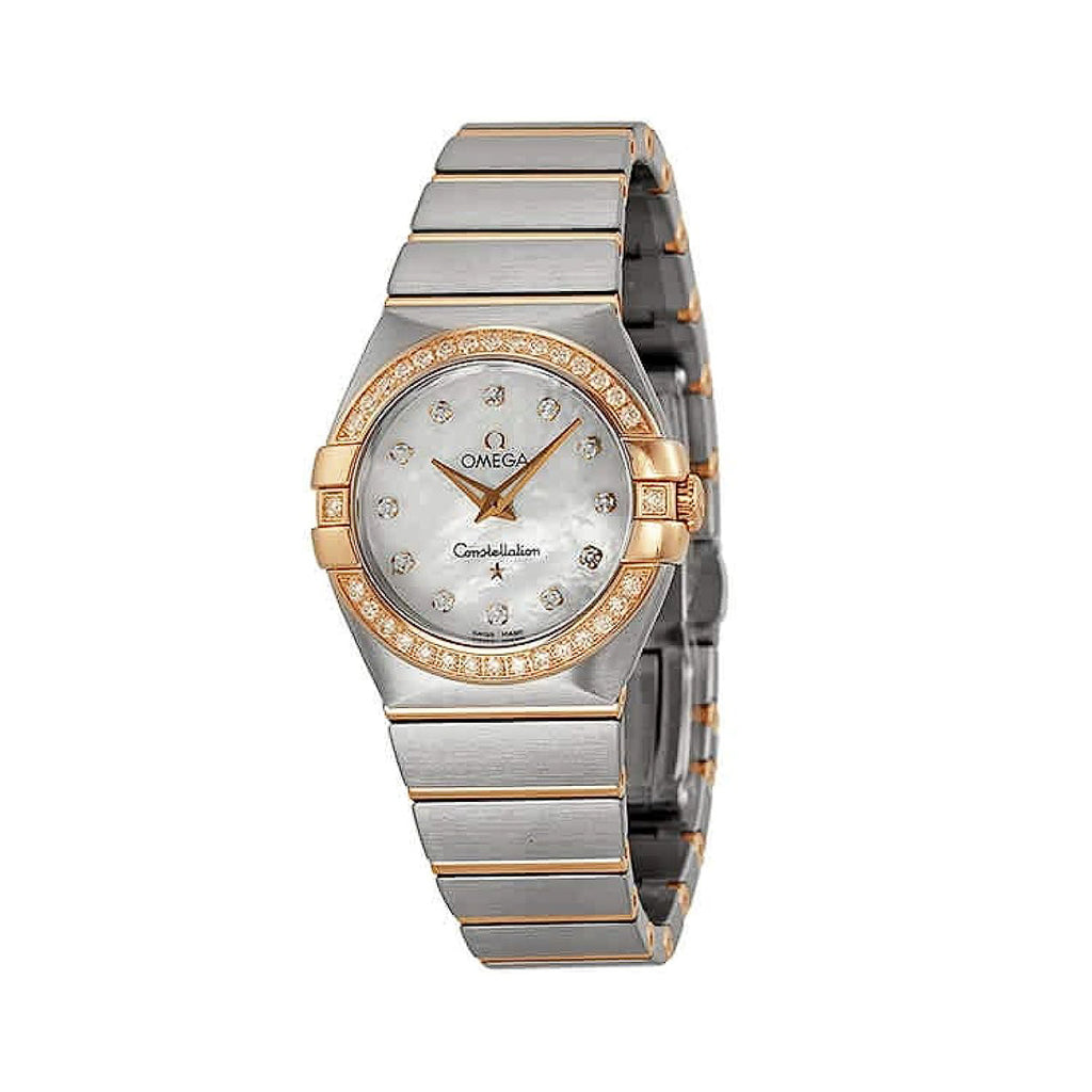 Discover timeless elegance with the Women's Omega Constellation Stainless Steel and 18K Rose Gold Watch, a masterpiece of Omega's distinguished craftsmanship. This pre-owned treasure, offered by Marks Jewelers, blends sophistication with precision, making it an essential addition to any discerning collection. The watch features a breathtaking pave diamond bezel and a mesmerizing white mother of pearl dial, enhanced by twelve meticulously set natural diamond markers, each showcasing unparalleled clarity and brilliance.Crafted with enduring elegance, the case and bracelet are made from robust stainless steel, with 18K rose gold accents enhancing its luxurious appeal. The iconic Omega logo and Constellation star, both in 18K gold, underscore its heritage and prestige. Designed for both style and resilience, the timepiece includes a scratch-resistant sapphire crystal and offers water resistance up to 30 meters (100 feet), making it perfect for everyday wear.Driven by a precise quartz movement, this watch measures 28mm in case size and is tailored to fit a 7" wrist, emphasizing its exclusivity as no additional links are available. As an estate piece, it carries the charm of unique history, refurbished by master jewelers to be cherished anew.Let this Omega Constellation be a testament to your personal achievements. Experience the allure of luxury and the assurance of quality with Marks Jewelers, where our graduate gemologists are dedicated to helping you find the perfect piece to celebrate your journey. Embrace this opportunity to own a piece of legacy and sophistication. Visit us today to make this exquisite watch yours.This item is an estate piece of jewelry, often one-of-a-kind, and has been previously owned. It has been refurbished by our master jewelers to be enjoyed again.